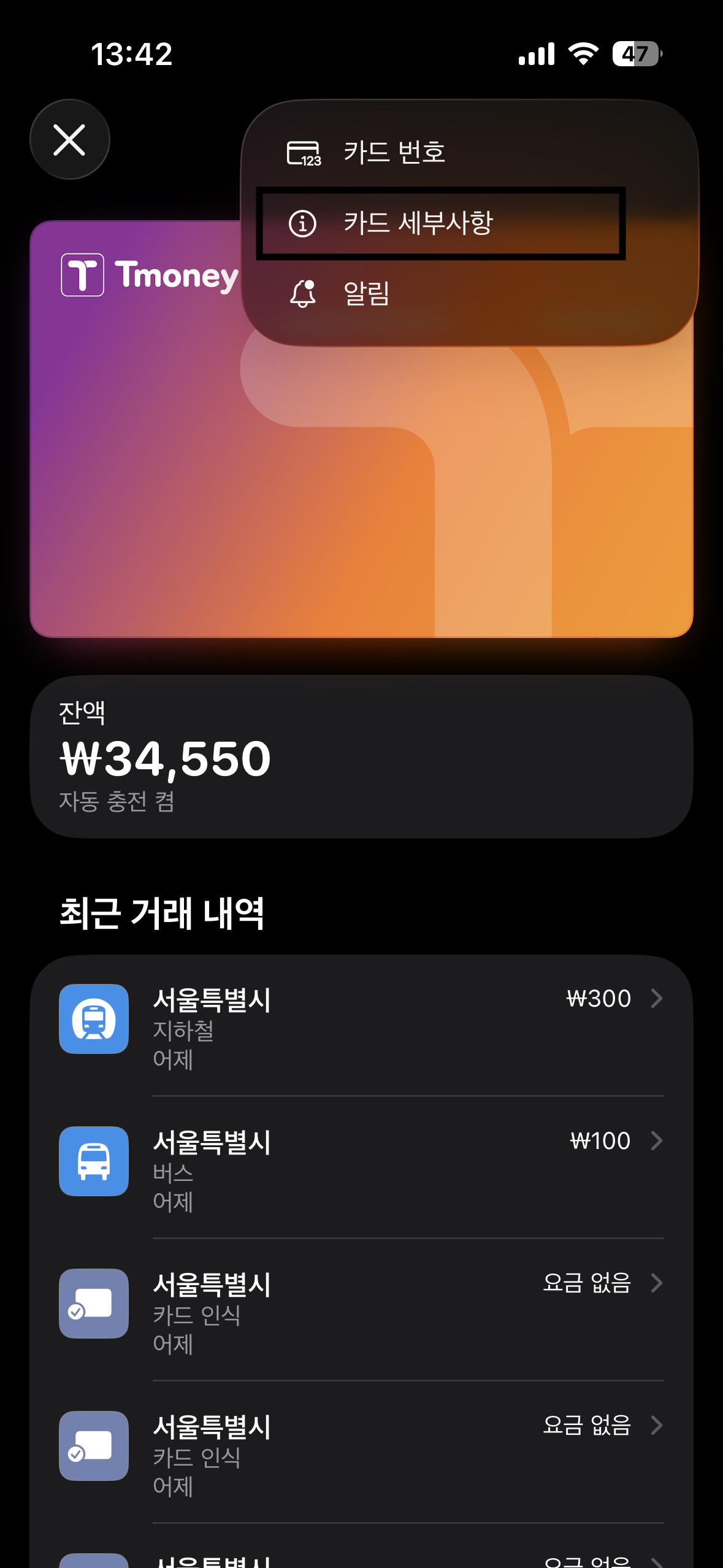 Apple 지갑의 티머니는 잔액이 일정 이하로 내려가면 자동 충전 기능을 설정할 수 있어, 충전 문제로 인한 불편도 줄일 수 있습니다.