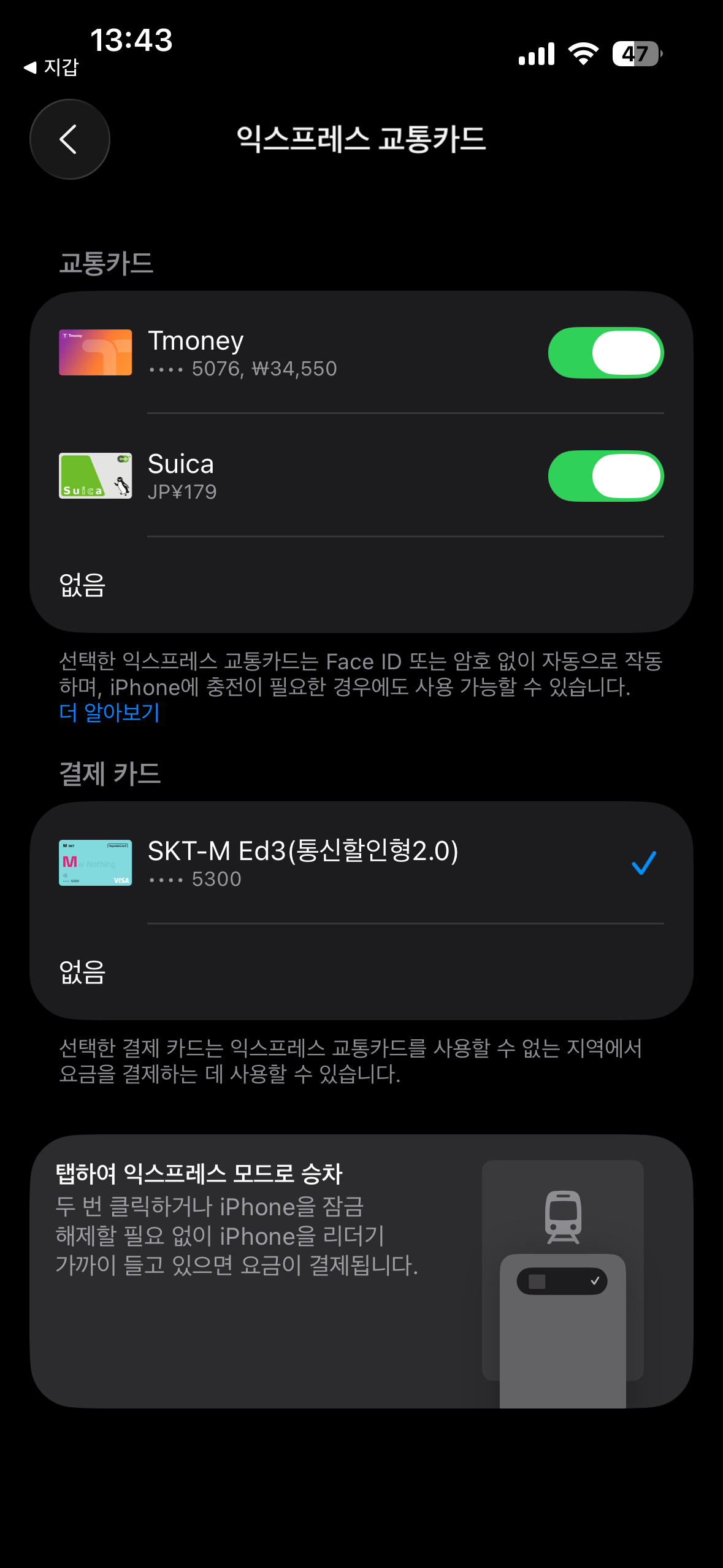 특히, 익스프레스 모드가 활성화되어 있다면, 기기를 잠금 해제하거나 화면을 켤 필요 없이 곧바로 단말기에 가까이 대기만 하면 태그가 인식됩니다.기기 전원이 절약 모드일 때에도 사용할 수 있는 점이 편리하죠.