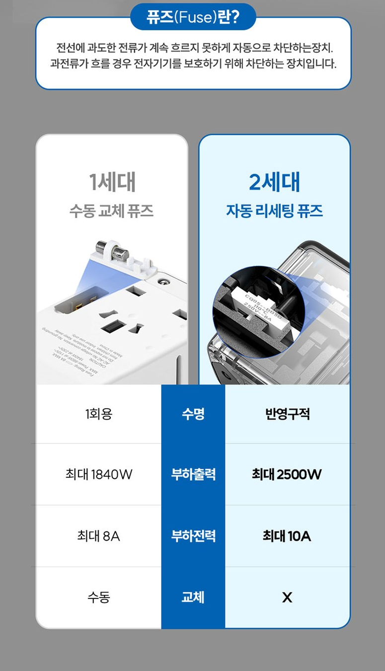 퓨즈라는 자체 전류 차단 장치를 가지고 있고 1회성이 아닌 자동리세팅 기능을 가지고 있어